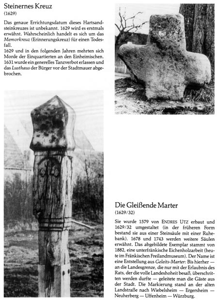 Auch der Zeitgeist der Hexenverbrennungen ging an Windsheim nicht spurlos vorüber. In den Jahren 1596-1597 kamen etliche Bürger und Bürgerinnen durch den Scheiterhaufen um. Während des 30-jährigen Krieges 1618-1648 erlebte auch Windsheim die Schrecken des Krieges. Der neue Galgen am Galgenbuck wurde 1622 errichtet, am gleichen Platz wurde schon 1380 ein Galgen erwähnt. Von 1619-1650 gab es zusätzlich einen Schnellgalgen am Marktplatz. Im Jahre 1632 bezog der Schwedenkönig Gustav - Adolf zweimal Quartier in Windsheim. Durch die vielen Einquartierungen musste Windsheim stark leiden , so dass 1635 die Stadt gerade noch ca. 50 Haushalte hatte. Am 10. März 1648 zog am morgen ein 16.000 Mann starkes schwedisches Heer auf um die Stadt einzunehmen. Nach schweren Artilleriebeschuss kapitulierte die Stadt am 13. März. In den darauf folgenden Tagen requirierten die Schweden viele Lebensmittel und Pferde. Am 16. März verließen sie wieder die Stadt. Die weitermarschierenden Truppen äscherten die umliegenden Orte: Ickelheim, Sontheim, Buchheim und Ergersheim ein.