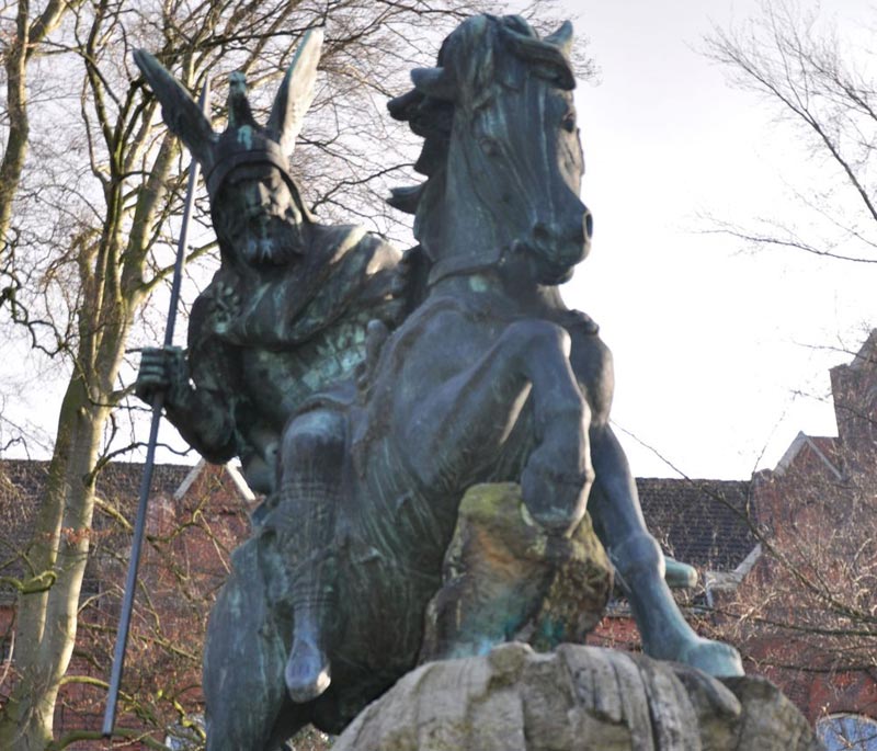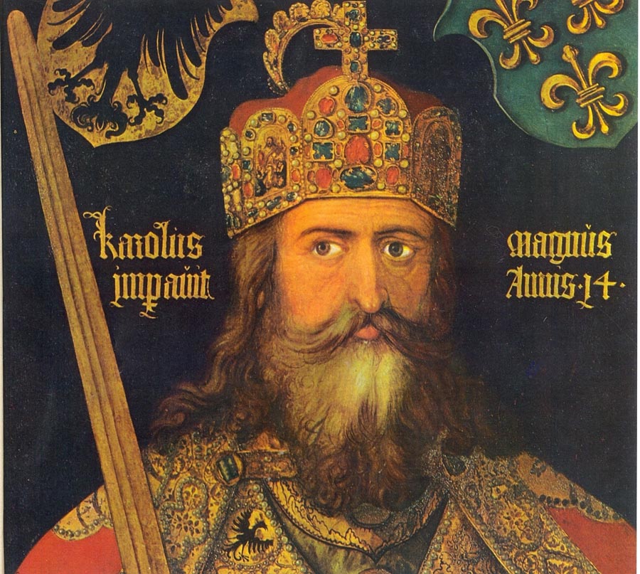 Ab 768 - 814 war Karl der Große König der Franken, zuerst mit seinem Bruder Karlmann, der 771 starb. Zunächst setzte er die Politik seines Vaters (Pippin der Jüngere) fort, 769 Unterwerfung Aquitaniens und Eroberung des Langobardenreiches. Durch Errichtung von Marken wie Pannonische Mark oder auch Awarische Mark (in Nieder- Österreich), Spanische Mark, Nordmark, Bretonische Mark, Dänische Mark und Sorbische Mark1, schützte er sein Reich. Unter Karl ging es zunächst um die Befriedung und Eingliederung der Sachsen. Aber die Kämpfe gegen die Sachsen waren blutig, Karl befahl 782 angeblich die Hinrichtung Hunderter von Sachsen, (4500?) sollen es gewesen sein, in Verden an der Aller. Karl der Sachsenschlächter, die Untat soll 782 in Verden an der Aller stattgefunden haben. Wobei Karl sie mit höchster Wahrscheinlichkeit nicht begangen hat. 4500 Männer einfach umgebracht? „Decollavit“, den Hals abgeschnitten, heißt es in einer Chronik. Aber ein Schreibfehler könne aus „delocavit“ „Decollavit“ gemacht haben. „delocavit“, also von Ort entfernt, umgesiedelt, Karl scheute keine Umsiedlungsaktionen, er siedelte Sachsen in Franken an. Karl rottete die Unterworfenen nicht aus, er gab den Sachsen als Königsleuten auch Arbeit und Brot auf den Königshöfen oder bei der Rodung der Wälder.