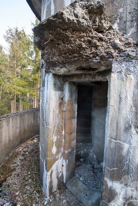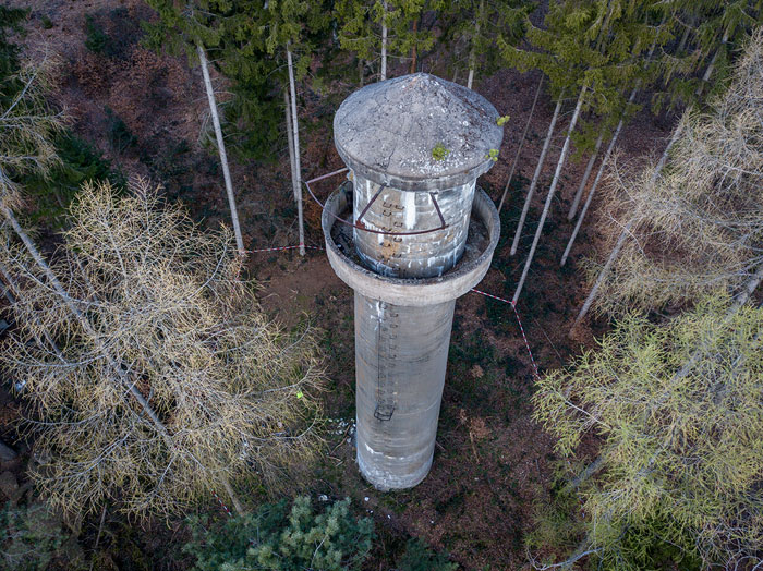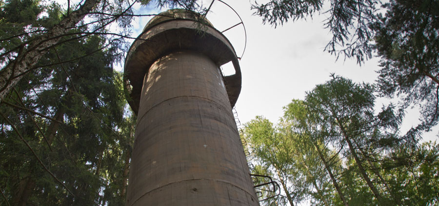 Der „Panzerturm“ war früher aus vielen Kilometern Entfernung zu sehen. Inzwischen ist er von hohen Bäumen verdeckt und selbst von Ortskundigen schwer zu finden. Er steht etwa 100 m von einem befestigten Weg.