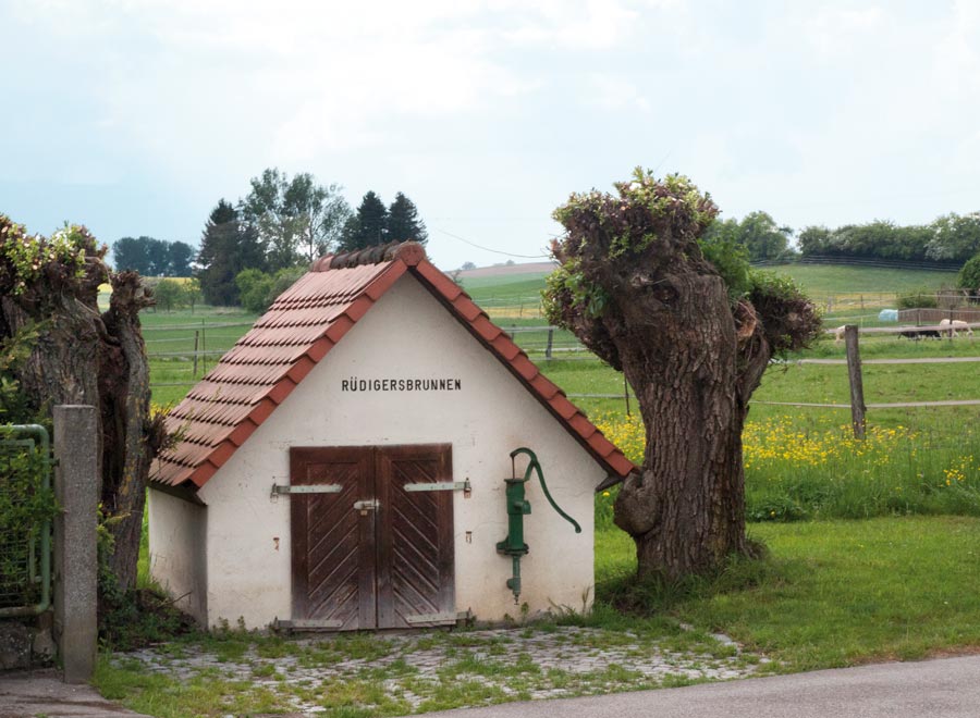 Einzelne Funde aus der Jungsteinzeit zeugen von einer frühen Besiedlung des Ortes. Rüdisbronn, ist eine der vier Osinggemeinden. Der Name des Ortes ist auf eine Quelle zurückzuführen, die früher als Heilquelle galt und sich jetzt in einem kleinen Brunnenhäuschen befindet. Das erste Mal wird Rüdisbronn 1158 urkundlich erwähnt. Zu dieser Zeit gehörte der Ort zu dem bambergischen Kloster Münchaurach. Dieses Kloster wurde mit all seinen Besitzungen 1158 von Kaiser Barbarossa unter seinen Schutz genommen. Dazu gehörte auch Rüdisbronn. Ursprünglich gehörte (Rußbrun)-Rüdisbronn, wie auch Humprechtsau und Ostheim(Kraut) in die alte Zehnt Schopfenloh (auf einem Berg bei Krautostheim). Der Ort hatte auch eine Wehranlage, die sich außerhalb befand, den Spielberg ein Turmhügel. Diese Anlagen stammen aus der frühen fränkischen Siedlungszeit als Wegestationen und Vorgängeranlagen der späteren Höhenburgen. Eine ähnliche Turmanlage ist auch in den Osinggemeinden Herbolzheim13 und Humprechtsau bekannt, in Herbolzheim liegt sie am Ortsausgang nach Krautostheim14auf dem Grundstück Hausnummer 32, in Humprechtsau in der Peunt der Hs.Nr.3. Der Spielberg wird auch in der Osingschenkung erwähnt. Entstanden ist diese Wehranlage vermutlich bereits im 10. Jahrhundert. 1357 wird Spielberg das erste Mal als Besitz eines Brendelin von Seinsheim erwähnt, zu diesem Zeitpunkt aber schon als Burgstall bezeichnet. Um diesen Burgstall ranken auch einige Sagen. Die Sage von den 3 Jungfrauen, es geht um einen Schatz am Spielberg, der von 3 Jungfrauen und einem schwarzen Hund bewacht wird.