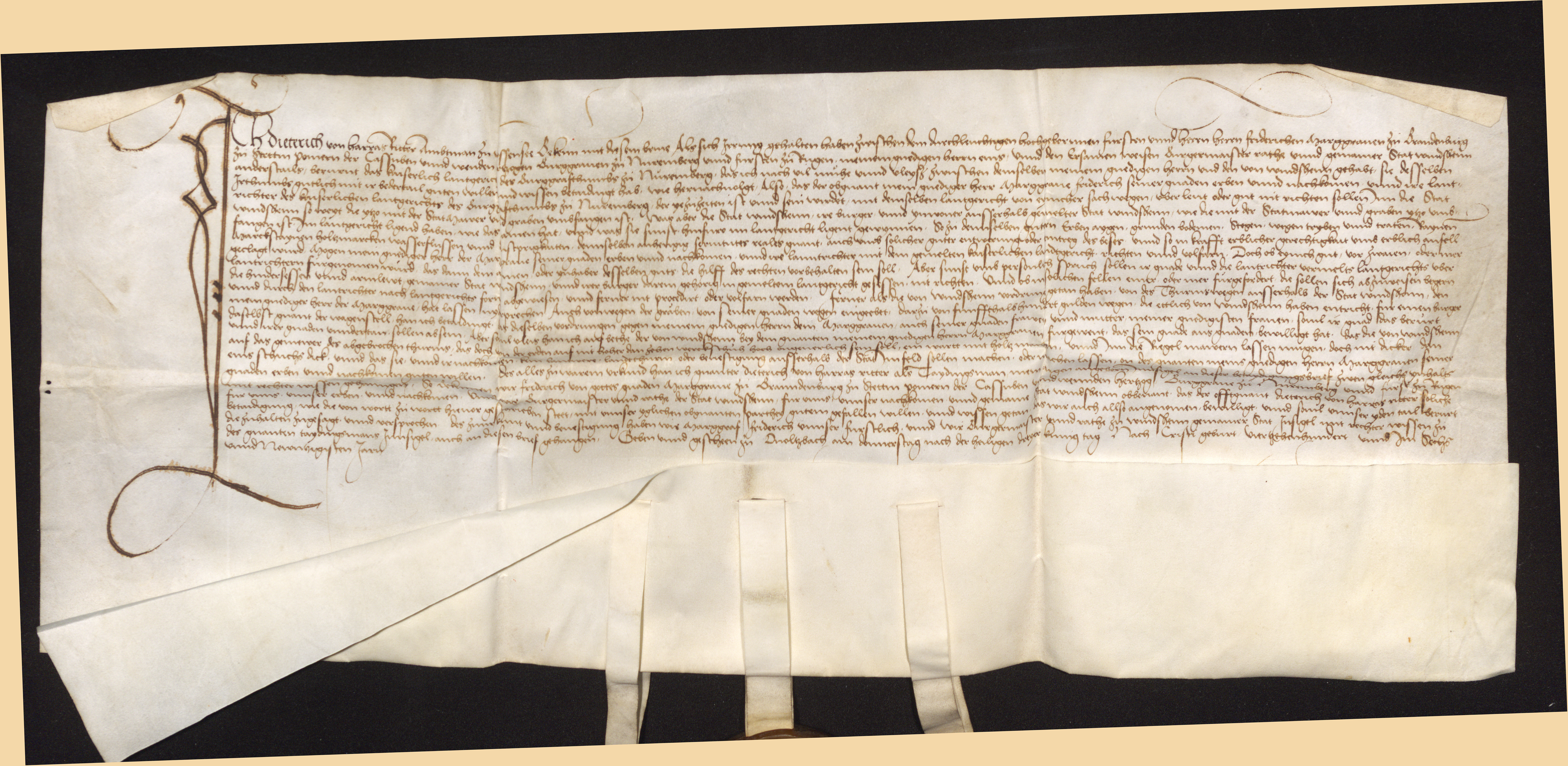 "Wir Fridrich von Gottes gnaden Römischer Keyser zu allen Zeiten mehrer des Reichs zu Hungern, Dalmatien, Croatien, König, Hertzog zu Österreich zu Steyr p.p. Entbieten unsern und des Reichs lieben getreuen Bergermeister und Rath der statt Windsheim unser gnad und alles guts, liebe getreue, wir empfehlen Euch von Römisch Keyserliche macht bey vermeidung unser und des Reichs schweren Ungnad und Straff ernstlich gebietend, daß sie die Wartthurm und graben, so durch weyland Eure Vorforderen zu befriedung der jetzt genannten statt Windsheim in unser und des heiligen Reichs und derselben statt grund und boden auffgericht, und nochmahls durch Euch mit einem steinernen Wartthurm erneuert und gebeßert worden, und in kurz verschinen Tagen durch den hochgeborenen Fridrichen Marggraffen zu Brandenburg unsern lieben Oheim und fürsten und die seinen aus aigenen gewalt und frevel Nidergelegt eingezogen und verricht sein, fürterlich widerumb erhöl[h]et, auffrichten und bauen laßet, und die zu Unsern des heiligen Reichs und der gemelten Statt notthurft, wie sich gebühret für stehet, und darinne mit verzihet, dadurch Uns und dem heiligen Reich nit schad darauß entstehe, als ihr zuthun schuldig seit daran thut ihr unsere ernstliche meinung.