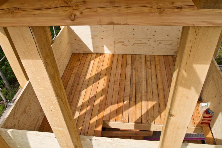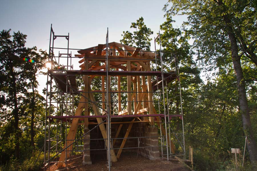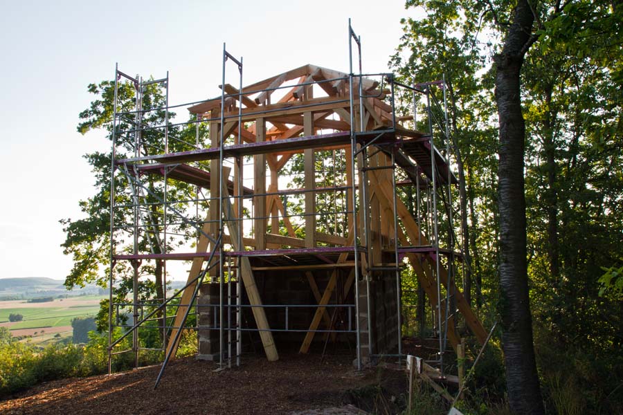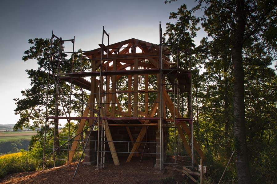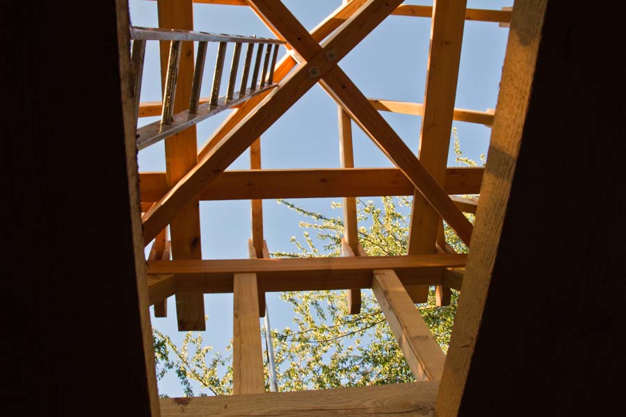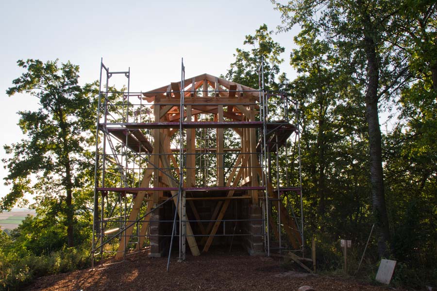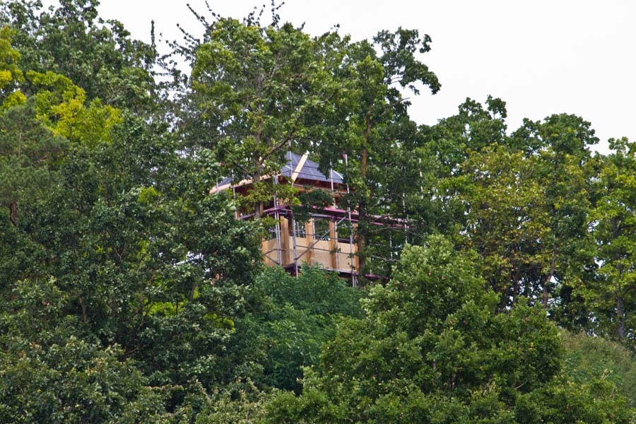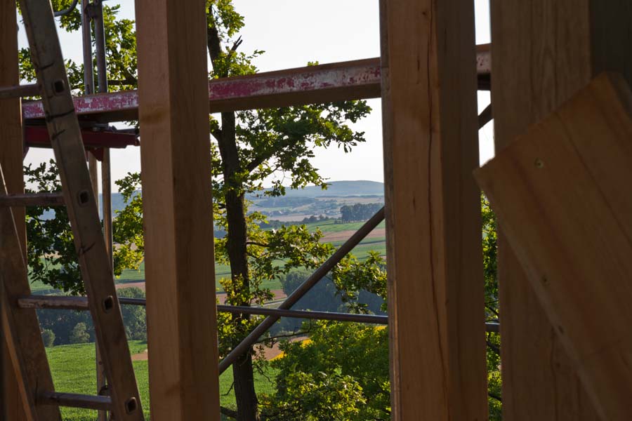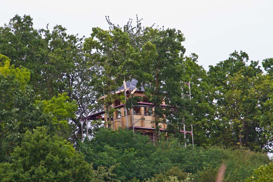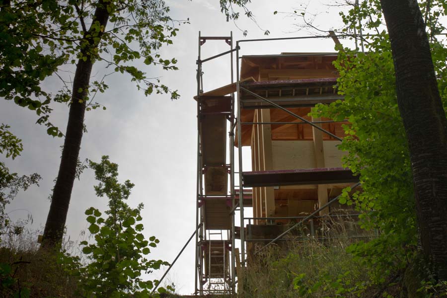 Hier ist die Aussichtsplattform schon eingezogen und auch schon Dachschindel sind angebracht