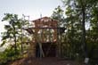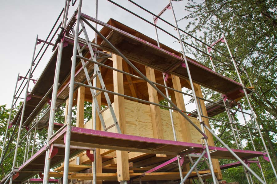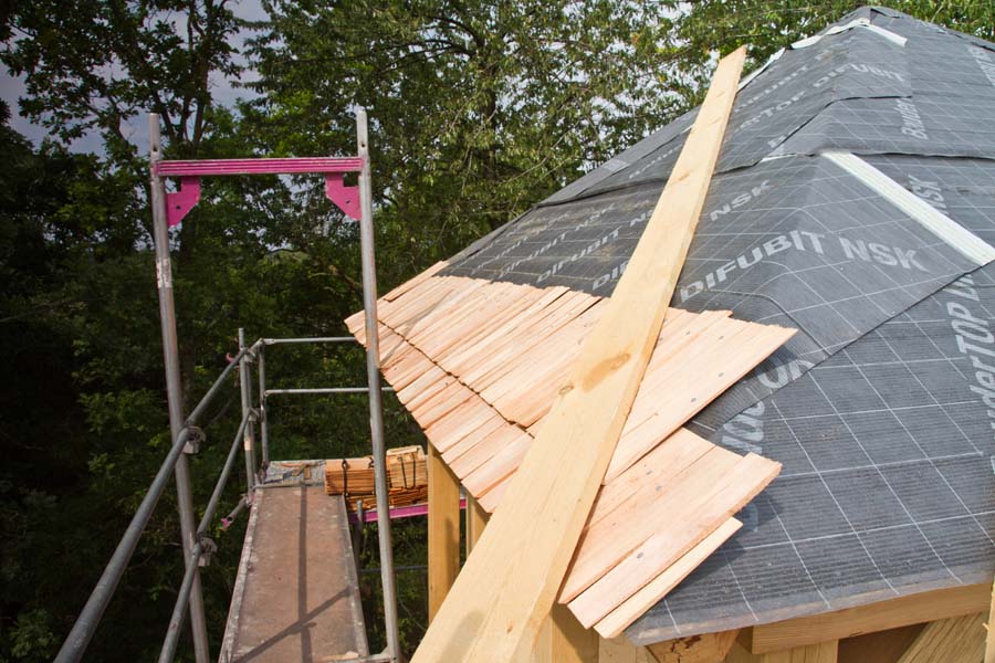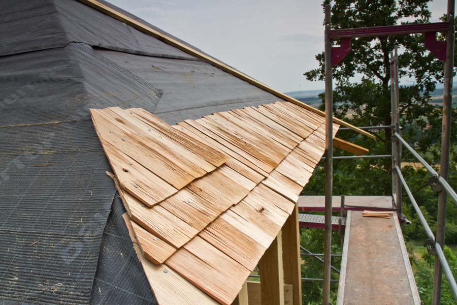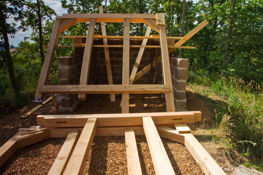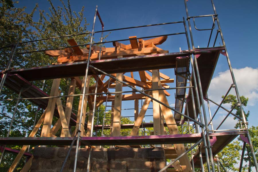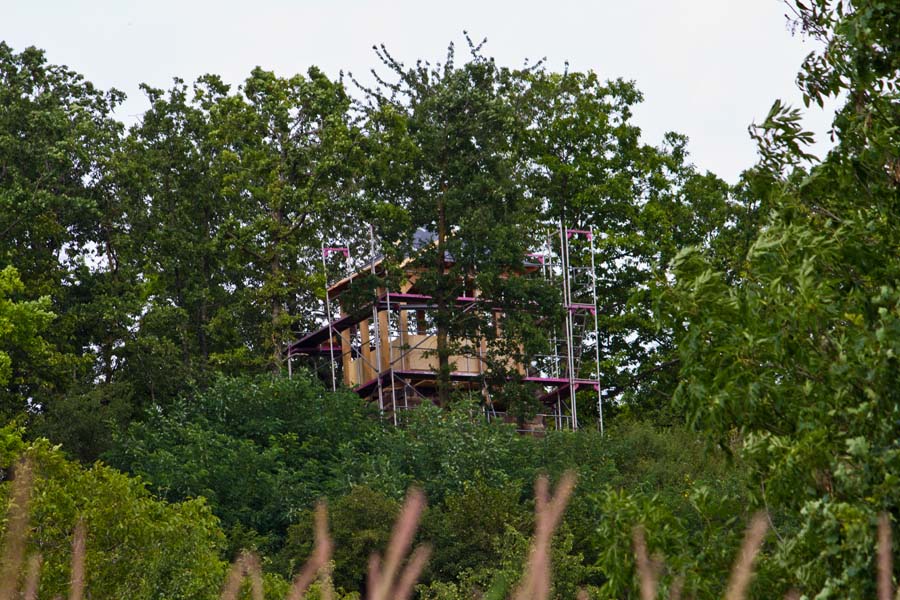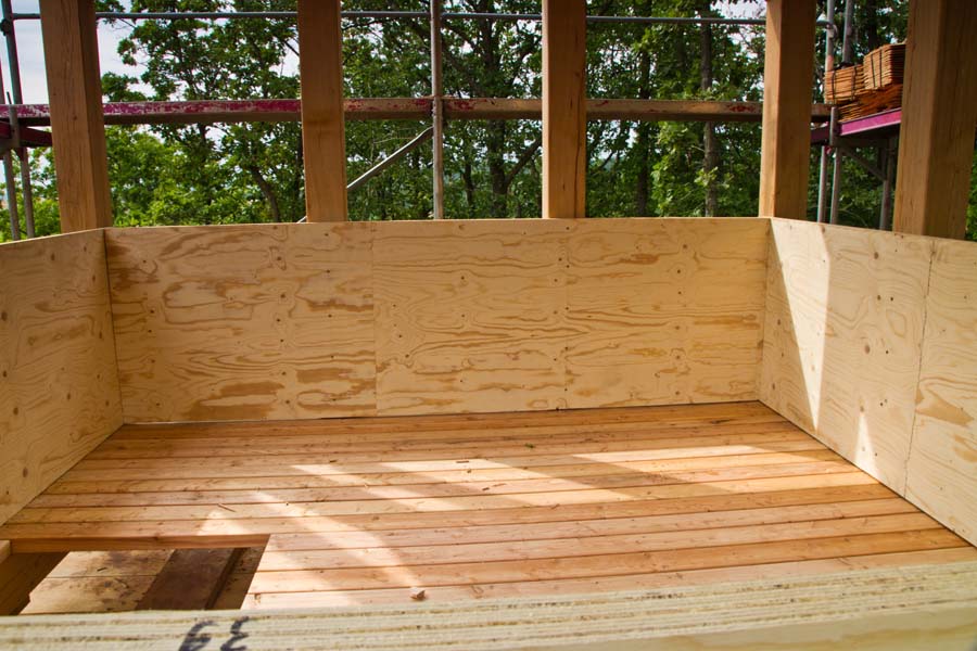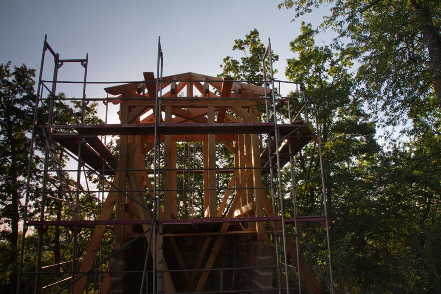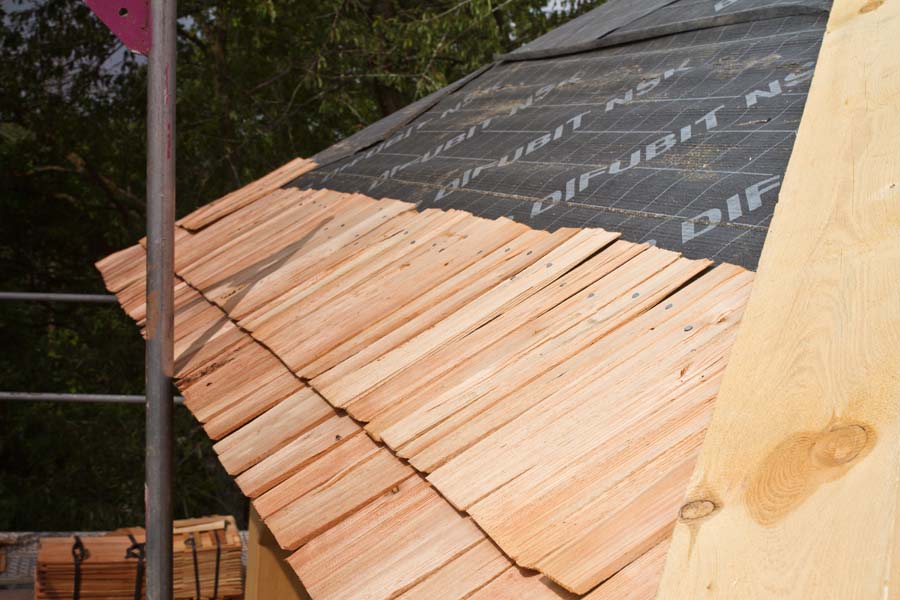 Hier ist die Aussichtsplattform schon eingezogen und auch schon Dachschindel sind angebracht