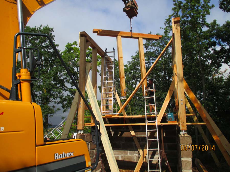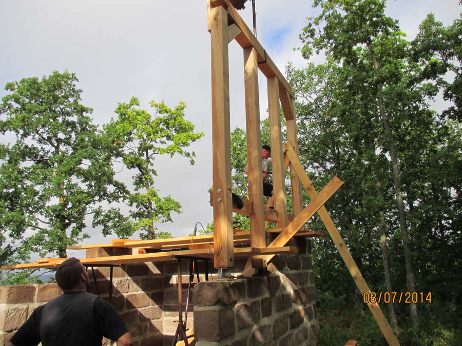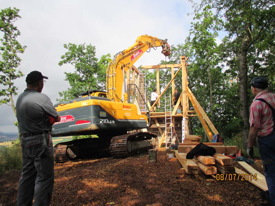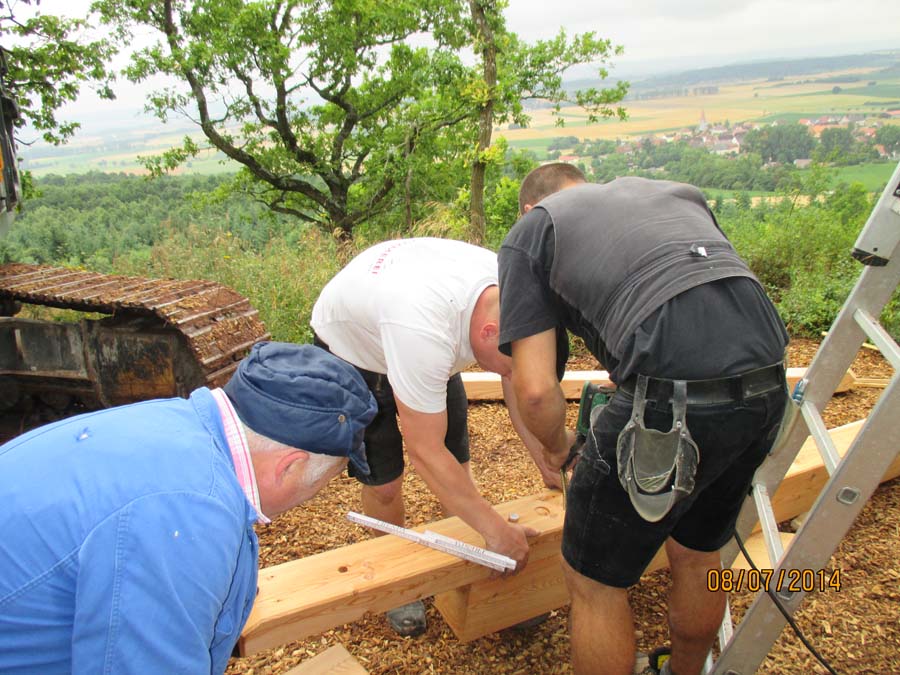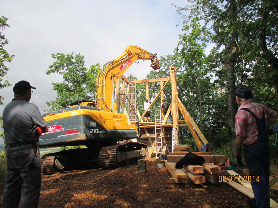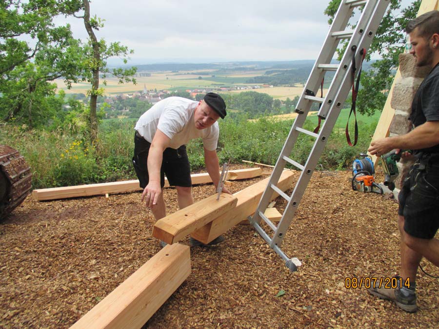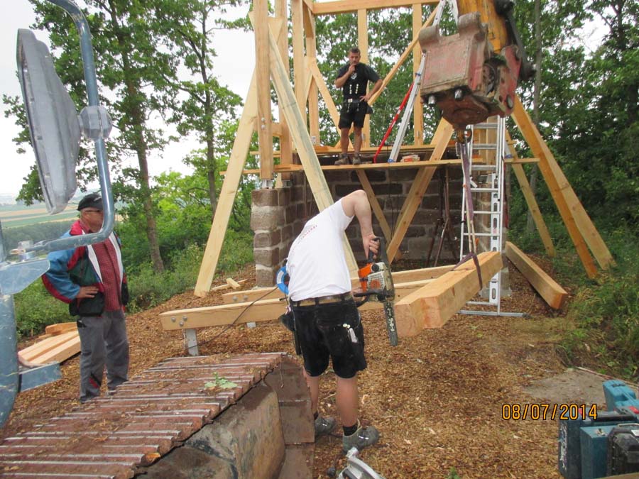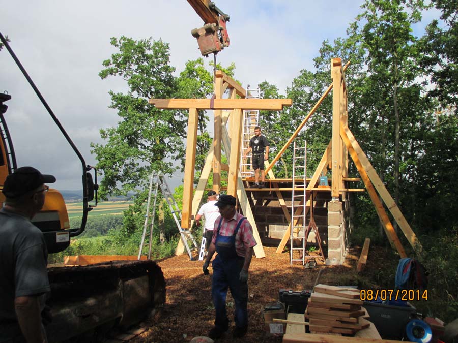 Das Heraufschaffen und Aufbauen des Holzgewerk für den Kunigundenturm
