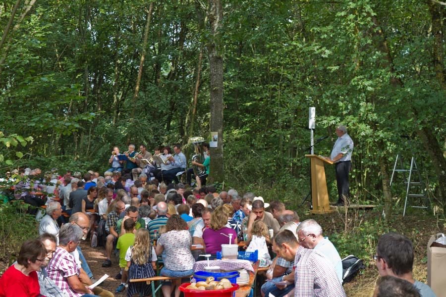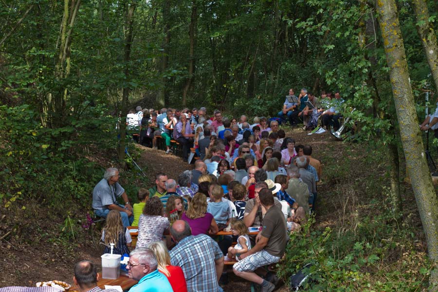 Die Einweihung des Kunigundenturms fand am 27. Juli mit einem Gottesdienst, Festrednern und Festgästen statt. Auch das Wetter war ideal und die Stimmung auf dem Spielberg hervorragend. Den Festgottesdienst, begleitet vom Posaunenchor Kaubenheim - Berolzheim, hielt Pfarrer Otto Jagusch. Festredner waren der Bürgermeister der Stadt Bad Windsheim Bernhard Kisch, der stellvertretende Landrat Norbert Kirsch, die Kaiserin Kunigunde und Georg Rudolph vom Osingverein und natürlich Wilhelm Greifenstein vom Heimatverein Rüdisbronn. Einlagen in fränkischer Mundart kamen von Heinrich Stiegler aus Erkenbrechtshofen. Zum Essen gab es ein Weißwurst - Frühstück. Nachdem die offizielle Einweihung abgeschlossen war ging es noch einige Zeit mit gut gelaunten Gästen auf dem Spielberg weiter. Der Aussichtsturm ist nun eröffnet und freut sich auf hoffentlich viele Besucher die den Aufstieg wagen. Belohnt werden sie bei klaren Wetter durch die herrliche Fernsicht in die Windsheimer Bucht und die weitere Umgebung. Ein Fernglas dabei zu haben wäre natürlich von Vorteil.