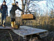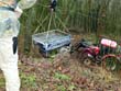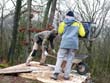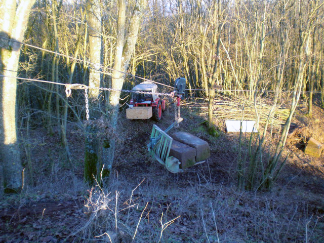Mit mehreren Schleppern Seilzügen und anderen Technischen Hilfsmitteln wurden die gebrauchten Sandsteine für den 1. Stock des Turmes nach oben gehievt.