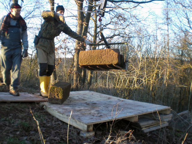 Am 15. Dezember 2013 wurden dann die Sandsteine für den 1. Stock des Kunigundenturms auf den Turmhügel geschafft.