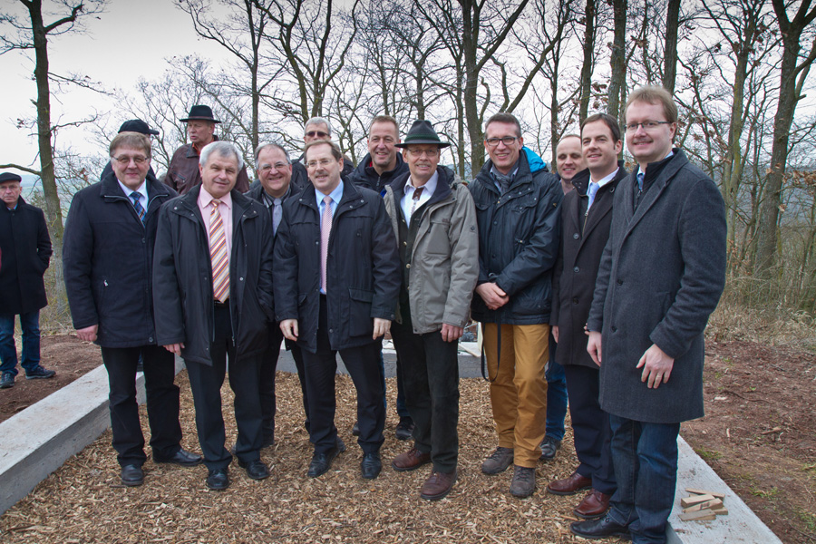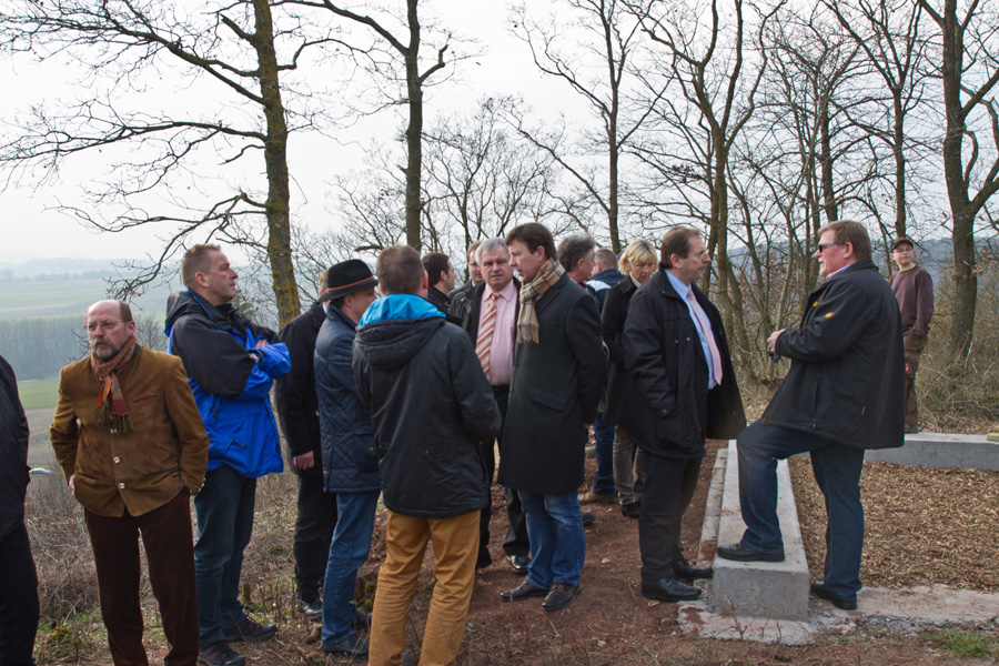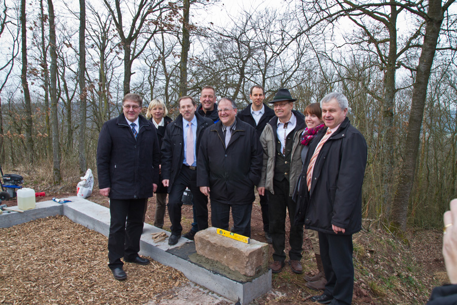 Pünktlich zu 10. Jahrestag der Gründung des Heimatvereins Rüdisbronn, unter seinem Vorsitzenden Wilhelm Greifenstein, trafen sich am Samstag den 1. März 2014 auf dem Spielberg Sponsoren, Honoratioren aus der Politik, Bürger aus Rüdisbronn, Bad Windsheim und Umgebung zur Grundsteinlegung für den noch zu errichtenden Kunigundenturm. Im Dezember 2013 begann der Heimatverein Rüdisbronn mit der Schaffung eines Zufahrtsweges und dem Heranschaffen des Baumaterials für den Grund des zukünftigen Holzturms. Der Grund ist als Betonsockel vorgegeben, darauf kommt nun als 1. Stock eine Sandsteinmauer und wieder darauf eine Holzkonstruktion die als späterer Aussichtsturm dient. Ohne Zuschüsse aus verschiedenen Töpfen und auch Spenden aus der Bevölkerung wäre eine Realisierung eines solchen Projekts finanziell fast nicht möglich gewesen. (Als kleine Anekdote ist hier angemerkt, Viktoria, ein kleines Mädchen aus Beerbach, schlachtete ihr Sparschwein um den Turmbau zu unterstützen.) Etwa 38000,- Euro soll der Bau kosten, rund 11000,- Euro sind an Spenden gesammelt worden. Etwa 16000,- Euro Unterstützung kommen aus europäischen Mitteln, die von der Lokalen Aktionsgruppe Aischgrund (LAG) organisiert wurden.