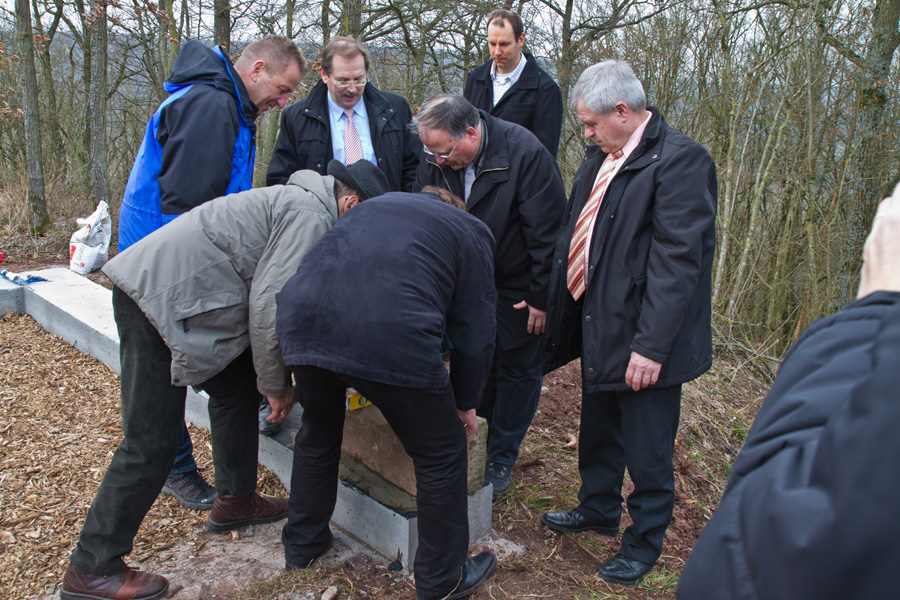 Am 31. Mai 2014 begannen die Vorbereitungen zum Aufrichten des Sandsteinsockels am 5. Juni war er aufgerichtet.