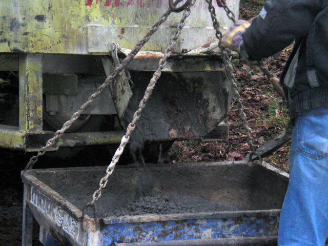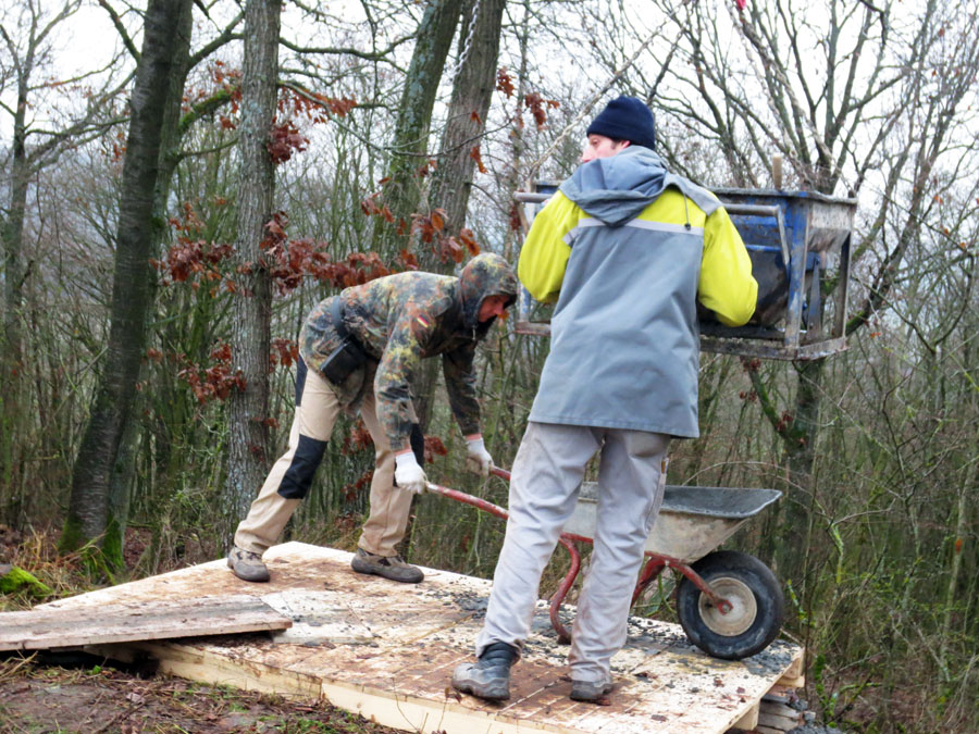 Bedingt durch den milden Winter konnte der Betonsockel für den Kunigundenturm bereits im Dezember 2013 erstellt werden. Hierzu wurden Helfer und natürlich Material benötigt. Das heraufschaffen des Betons und der anderen benötigten Materialien war kein leichtes Unterfangen. Mensch und Technik waren gefordert aber bis zur Grundsteinlegung war alles bewältigt.