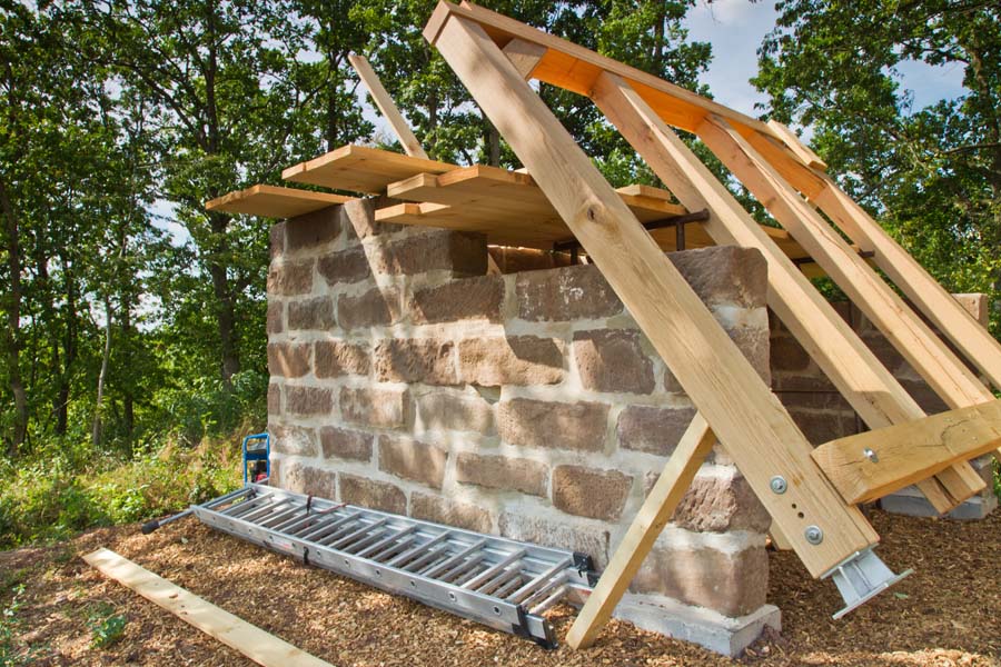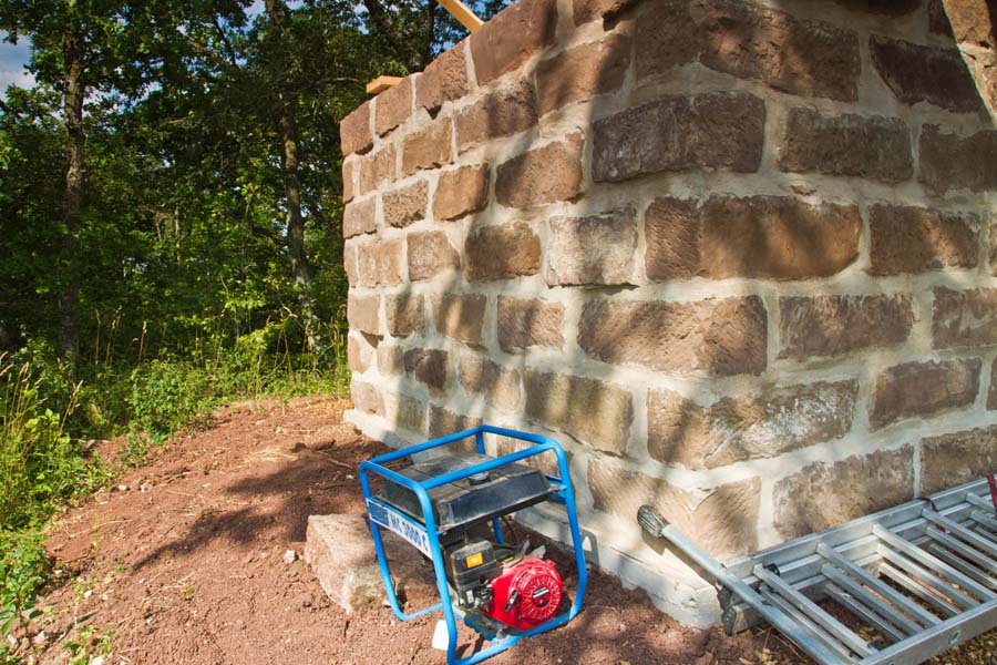 Anfang Juni wurde der Grundstock des Kunigundenturms aus Sandsteinen gemauert. Mit Hilfe eines kleinen Baggers wurden die Sandsteine entsprechend den Anweisungen des Maurers durch die Helfer platziert.