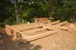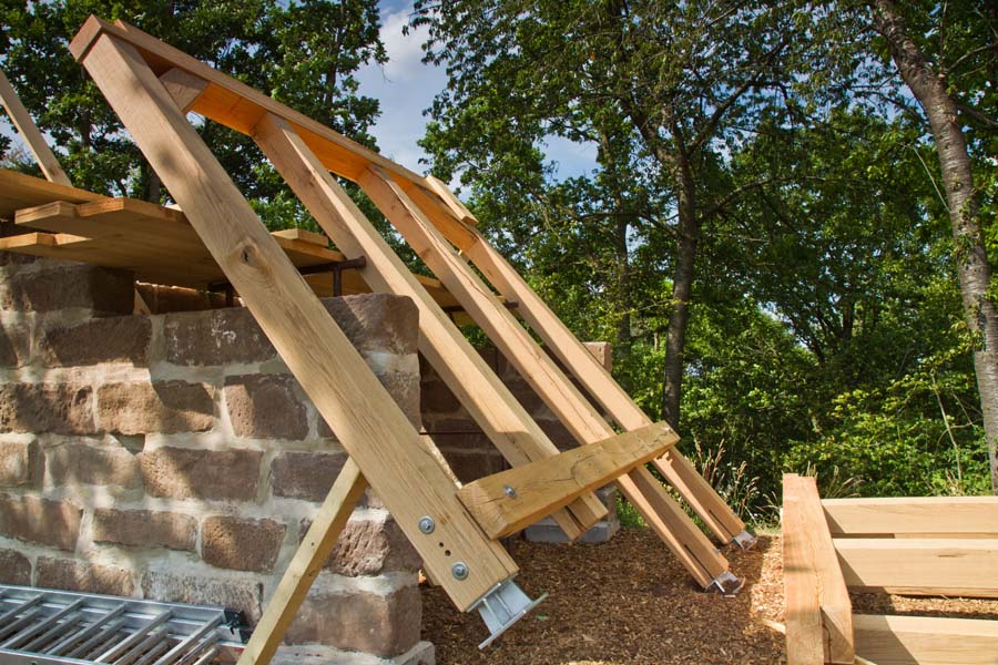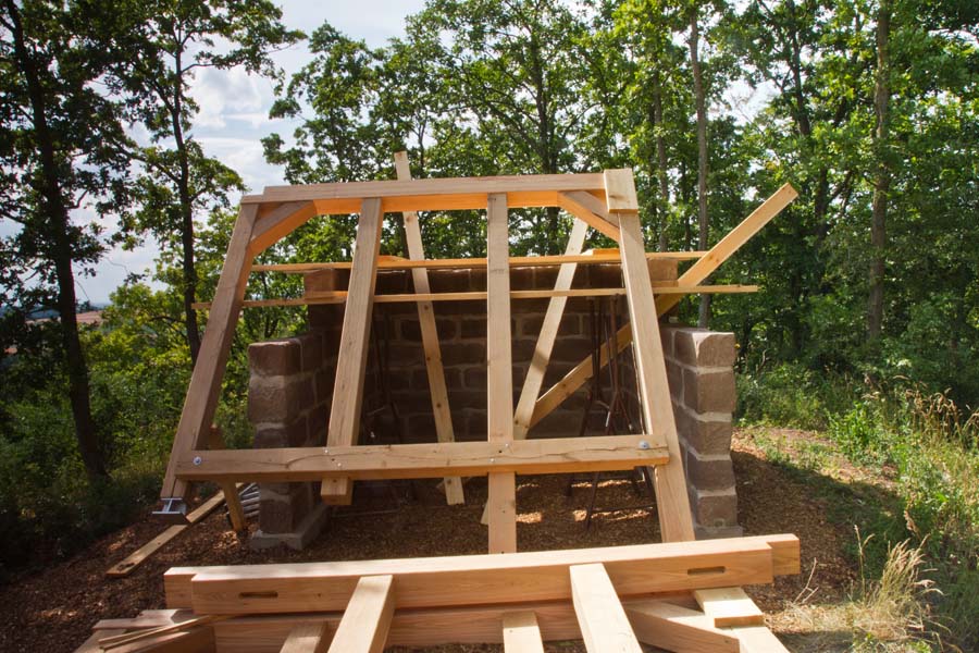 Anfang Juli wird dann die teilweise vorgefertigte und vormontierte Balkenkonstruktion auf den Spielberg und dann auf das Plateau gebracht. Diese Holzkonstruktion für den Turm besteht aus schweren massiven Holzbalken die erst durch Zuhilfenahme eines Bagger in die richtige Position gebracht werden können. Ein Versuch mit einem Autokran schlug vorher fehl.