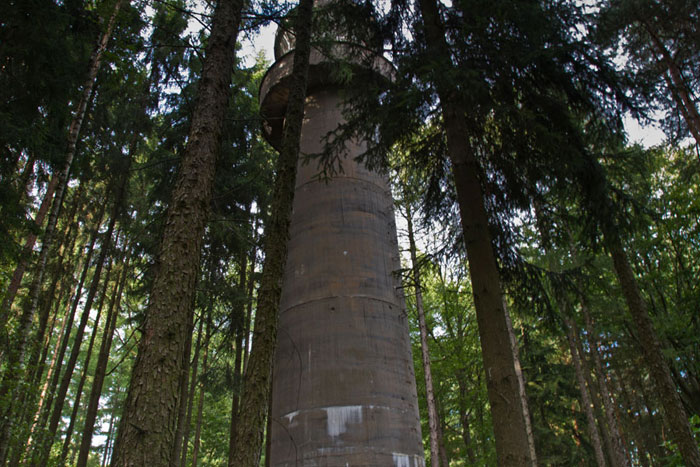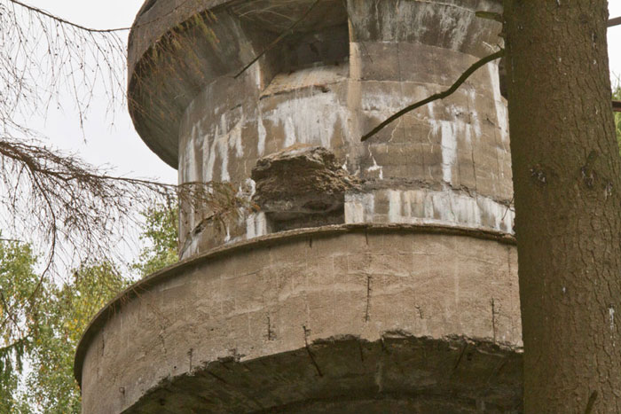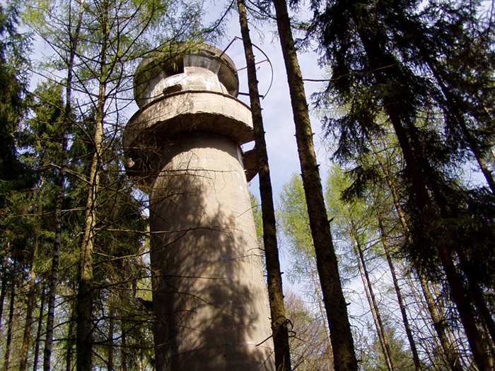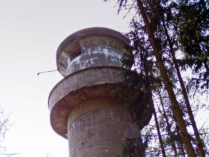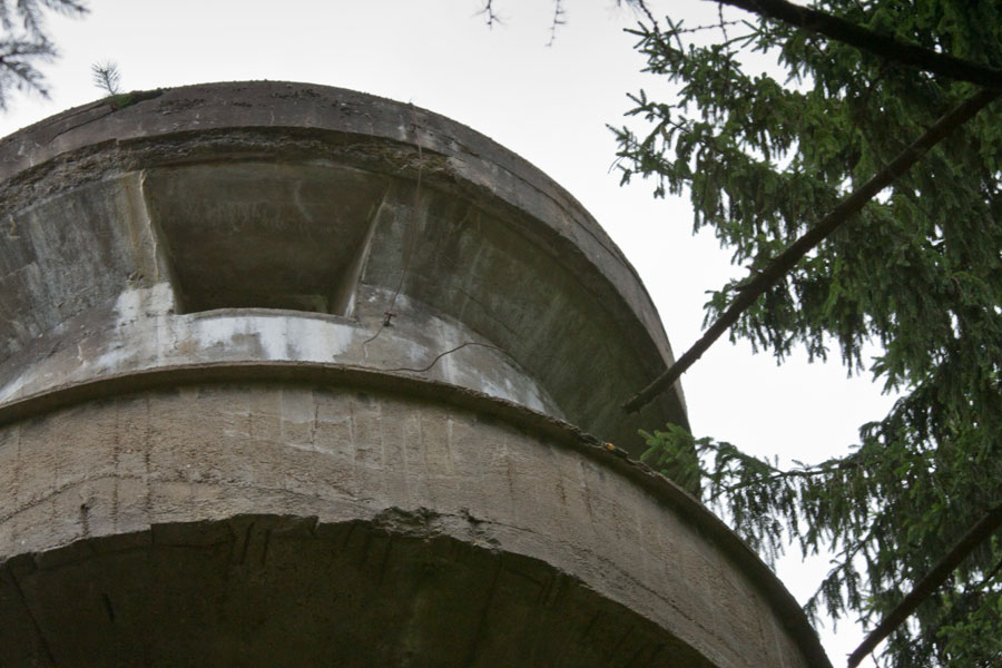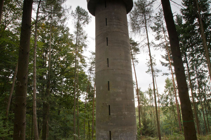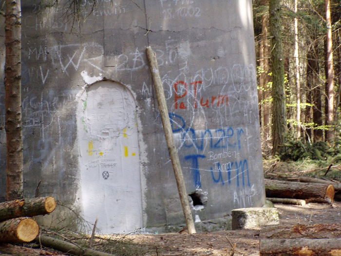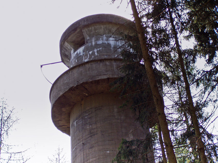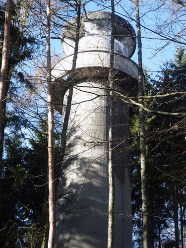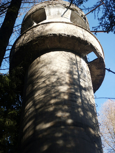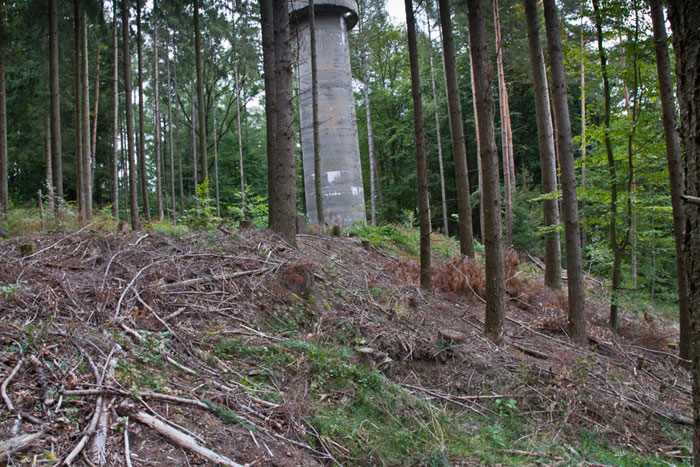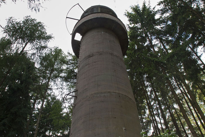 Der „Panzerturm“ war früher aus vielen Kilometern Entfernung zu sehen. Inzwischen ist er von hohen Bäumen verdeckt und selbst von Ortskundigen schwer zu finden. Er steht etwa 100 m von einem befestigten Weg.