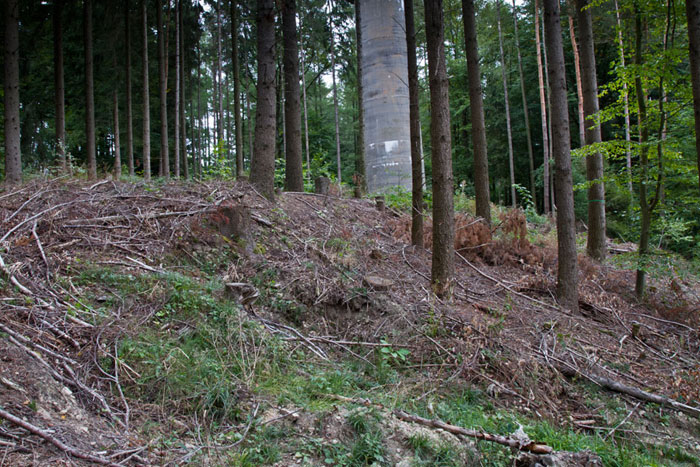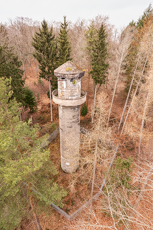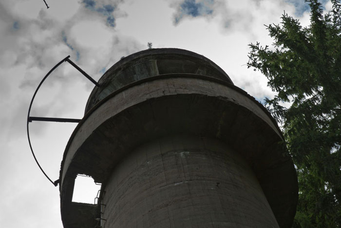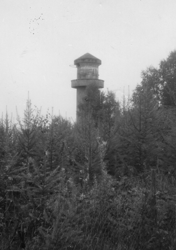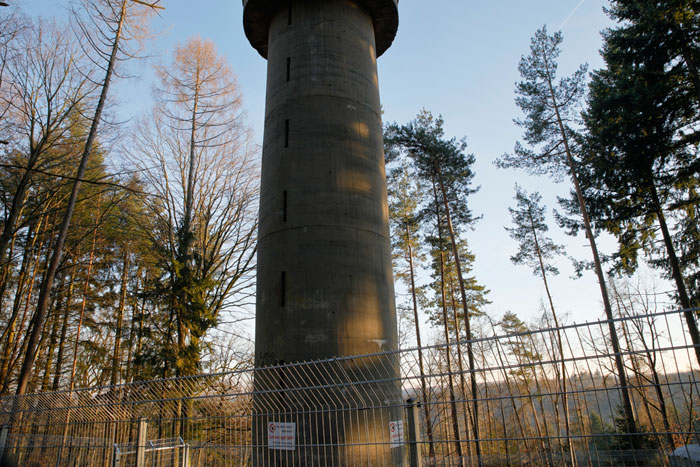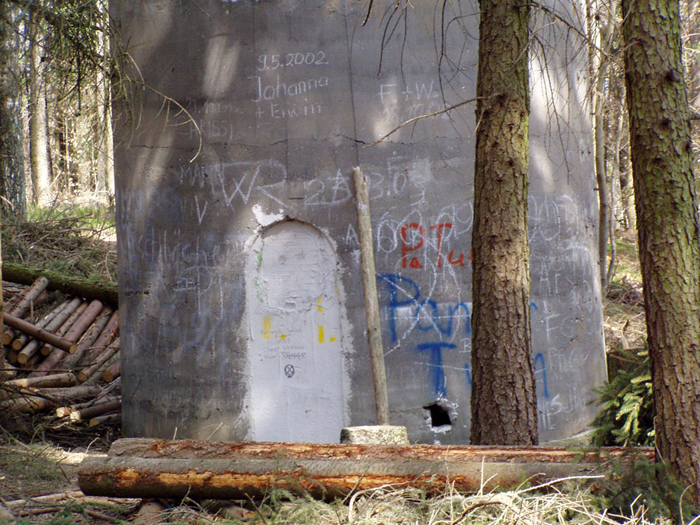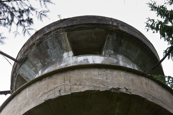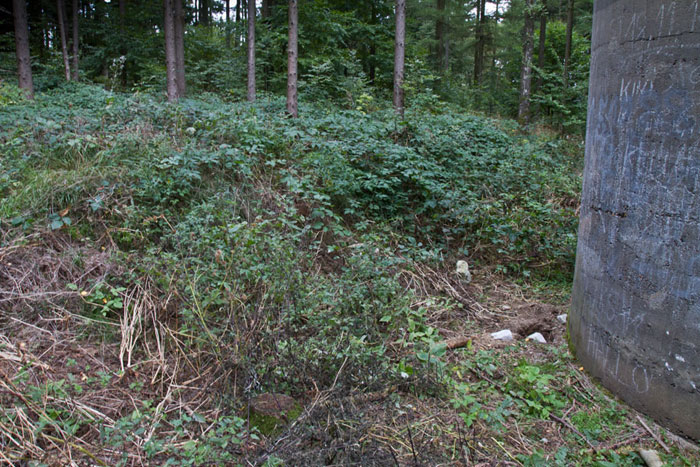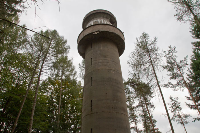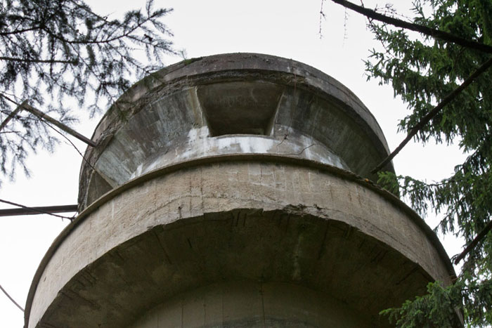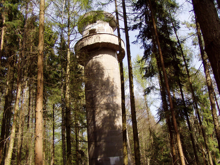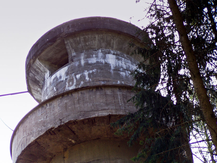 Der „Panzerturm“ war früher aus vielen Kilometern Entfernung zu sehen. Inzwischen ist er von hohen Bäumen verdeckt und selbst von Ortskundigen schwer zu finden. Er steht etwa 100 m von einem befestigten Weg.