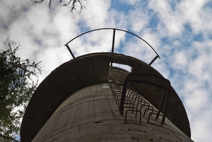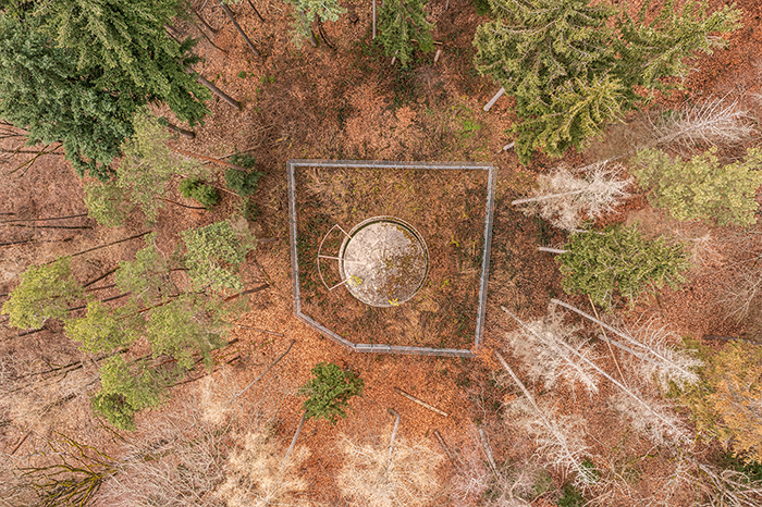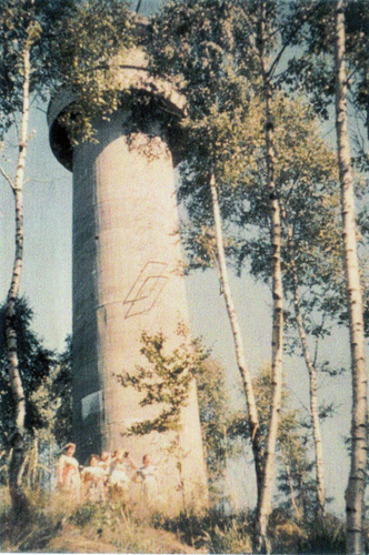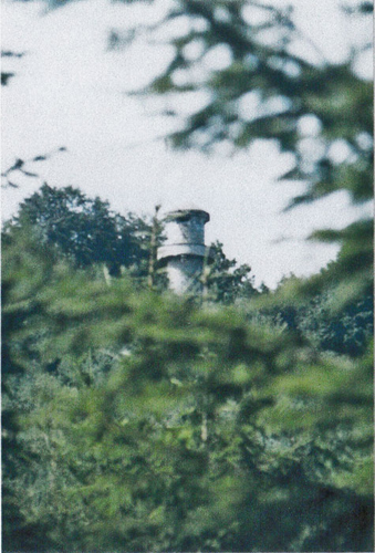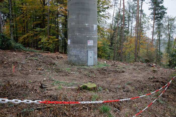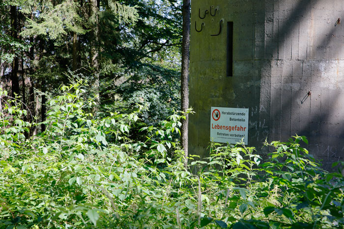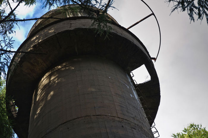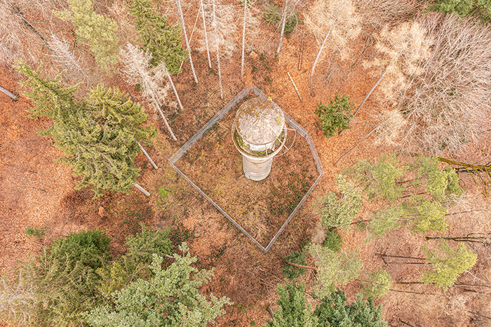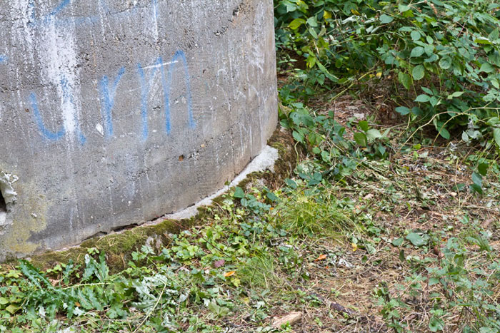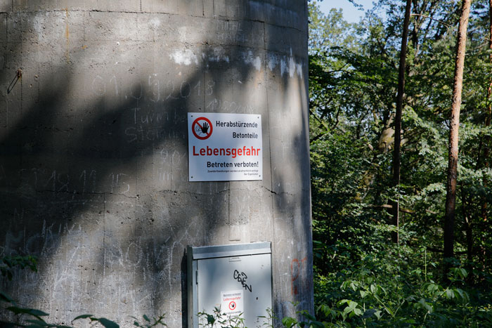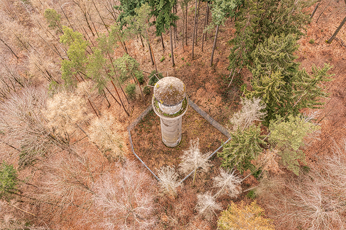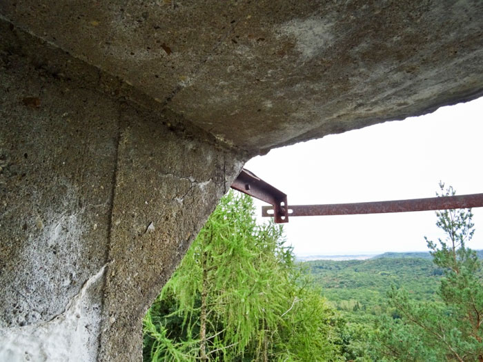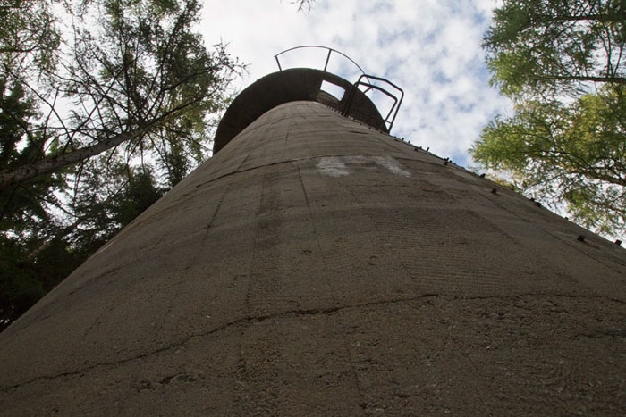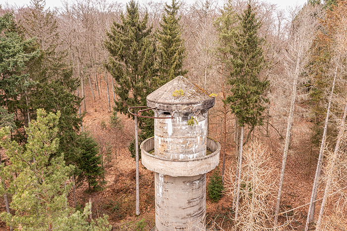 Der „Panzerturm“ war früher aus vielen Kilometern Entfernung zu sehen. Inzwischen ist er von hohen Bäumen verdeckt und selbst von Ortskundigen schwer zu finden. Er steht etwa 100 m von einem befestigten Weg.
