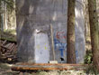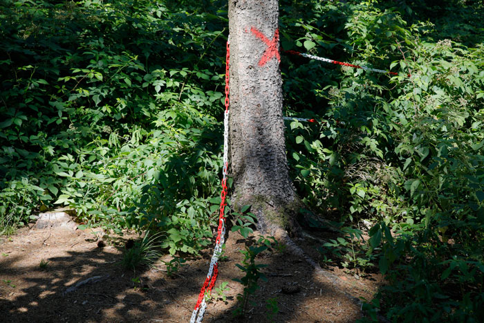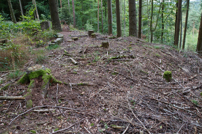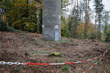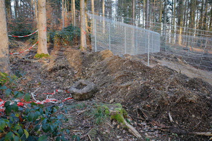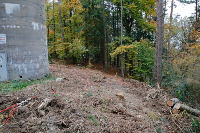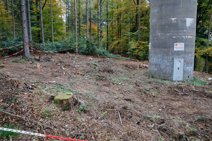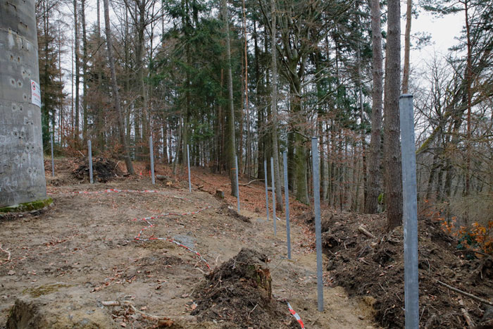 Bauplatz Panzerturm! Nein, nicht um den Panzerturm zu erhalten wird hier gebaut, sondern um eine Einzäunung geht es. Mit dieser soll der Bevölkerung der Zugang zum Panzerturm weiter Erschwert oder Verwehrt werden. Der sich 2019 im Bau befindliche Zaun steht in keinem Verhältnis zu den betriebenen Aufwand. Durch die Türe ist der Zugang zum Turm ja bereits verwehrt. Dies alles erfolgt unter dem Denkmantel zur Verhinderung von Unfällen durch herabfallende Betonbrocken für die Besucher. Die Fläche um den Panzerturm ist bereits gerodet und auch die gerodeten Wege sind zu erkennen. Wie aus einem Bericht der Fränkischen Landeszeitung vom 29.10.2019 hervorgeht, sind laut Bundesimmobilienverwaltung in Reußenberg, Investitionen in den Turm nicht geplant und auch langfristig ist an keine Sanierung gedacht, er wird also gezielt unter staatlicher Aufsicht verfallen lassen. Dafür wurden aber jetzt, unter großen Aufwand, Wege durch das ehemalige Abwurfgelände gebaut um den Baumaschinen und Fahrzeugen den Zugang zum Turm zu ermöglichen. Zum jetzigen Zeitpunkt erwecken diese Wege den Eindruck einer Fehlplanung. Bis jetzt wurden sie nicht benutzt. Die letzten Meter des Weges sind vermutlich zu steil für Fahrzeuge. Selbst beim Bau des Turmes wurden hier Motorwinden eingesetzt. Das Material für den Zaunbau scheint bisher über einen Trampelpfad zum Turm gebracht worden zu sein. Dieser Pfad diente bisher ausschließlich als Zugang zum Panzerturm und führt über privates Gelände. Vergessen wird hier aber, daß laut Denkmalschutz-Gesetz der Besitzer eines Denkmals die Verpflichtung hat dieses zu pflegen, was hier ja nicht der Fall ist. Hier wird viel Geld für einen Zaunbau und die sinnlosen Wege verbrannt, anstatt es sinnvoll zur Sanierung des Denkmalgeschützten Turmes zu verwenden.