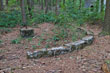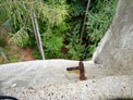 Nach der letzten Holz-Stiege beginnt unmittelbar rechter Hand an der letzten Podest-Kante eine Mauer, die kurz danach über eine Kurve in die Begleitung für n e u n betonierte Treppenstufen nach Osten (70 - 80 cm breit) übergeht. Beide verschmolzene Teile steigen freitragend schräg über eine starke bogenförmige Verstärkung bis zu einer Bodenplatte (ca.28 cm Stark) in ca. 2,00 m Höhe an. Gegenüber ist eine Anbindung an die nördliche Außenmauer.