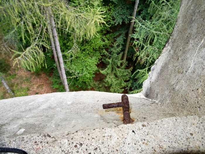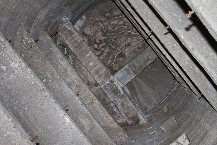 Im Laufe der Zeit wurde der Eingang zugemauert und wieder geöffnet. Von den 56 eingegossenen Steigeisen an der südlichen Außenseite, wurden 26 abgetrennt um Unfälle zu vermeiden.