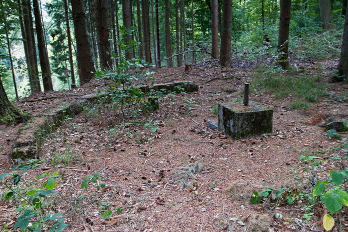 Die zu ebener Erde westlich nahe beim Turm, mit Seilzug bedienbar gewesene, Trefferanzeige mit der Metallachse ist noch in Teilen zu erkennen.