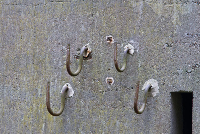 Vier Haken (ursprünglich sechs) für Telefon und Stromanschluß befinden sich noch an der Nordseite in Höhe der zweiten Lichteinfall-Öffnung. Die Isolatoren sind abgeschlagen. Es waren hier früher Steigeisen einbetoniert. Masten für Leitungen führten bis Markt Nordheim womit auch eine direkte Verbindung mit dem Fliegerhorst in Illesheim hergestellt war.