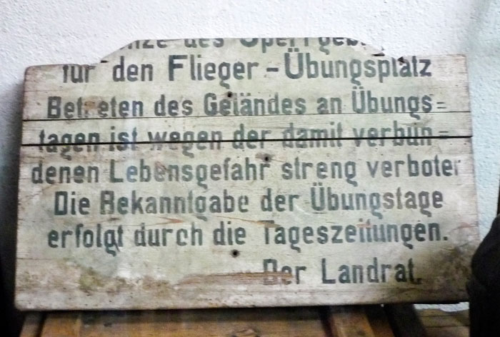 “Grenze des Sperrgebietes für den Flieger-Übungsplatz. Betreten des Geländes an Übungstagen ist wegen der damit verbundenen Lebensgefahr streng verboten. Die Bekanntgabe der Übungstage erfolgt durch die Tageszeitungen".