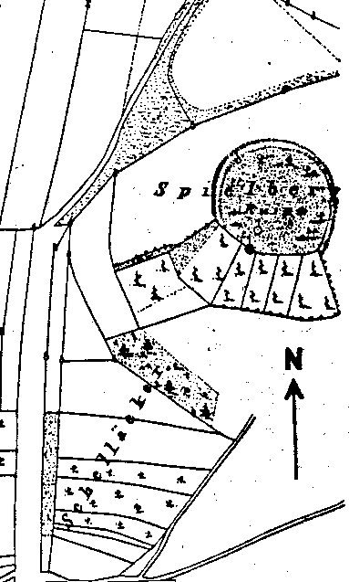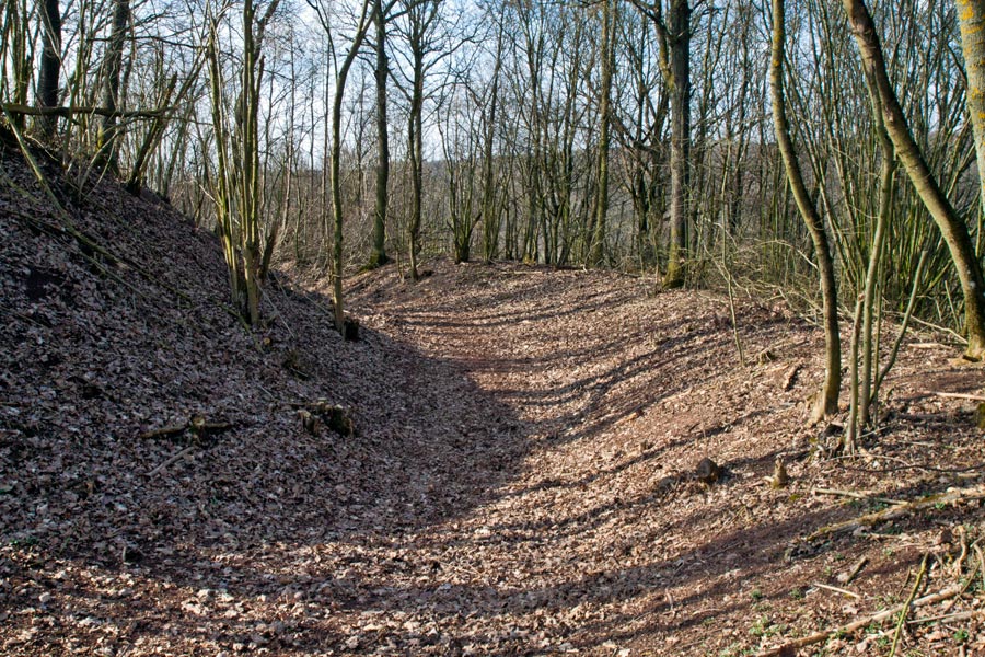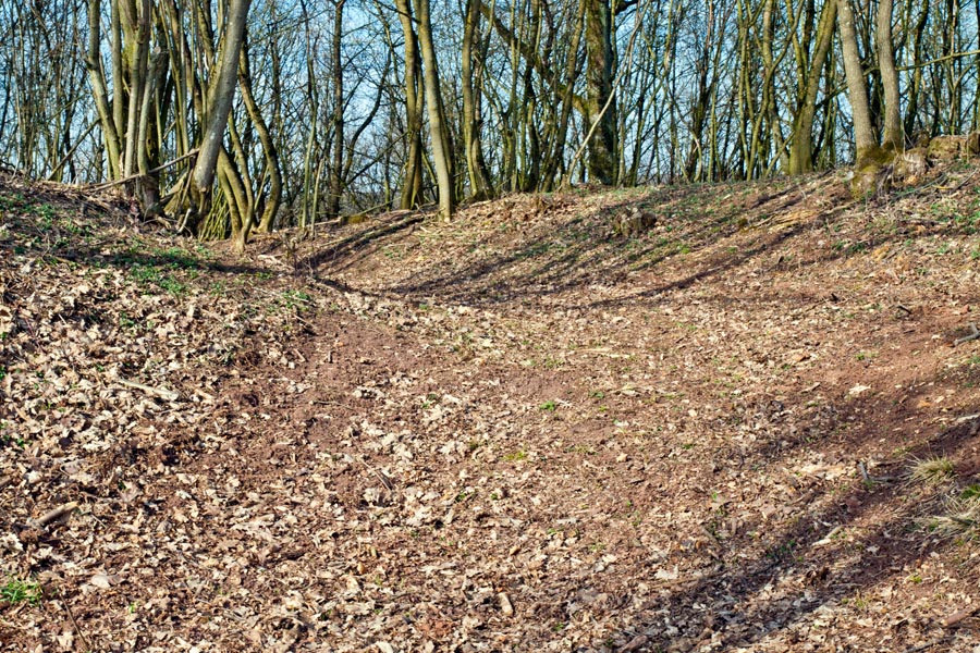 ehemaligen Graben zurückgehen könnte. Dieser Einschnitt quert den Zufahrtsweg und
