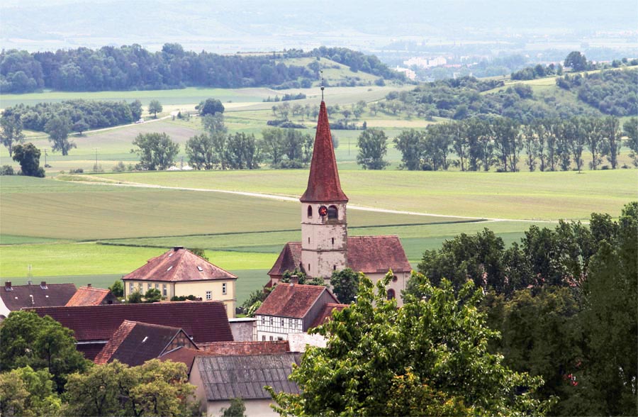 Die Wehranlage Spielberg, 420 Meter über dem Meeresspiegel, befindet sich zwischen Rüdisbronn und Rehhof. Sie entstand bereits im 10. - 11. Jahrhundert, in der Zeit des frühen fränkischen Burgenbaues und wurde wahrscheinlich bis ins Mittelalter als Wehranlage benutzt. Bereits 1357 wird der Spielberg als Burgstall genannt, im Besitz von Brendelin (Hildebrand) von Saunsheim (Seinsheim), dessen Enkel, Erkinger von Seinsheim und nach der Erhebung in den Freiherrnstand der erste Freiherr zu Schwarzenberg war. 1463 verschreibt Kunigunde von Thüngfeld, eine geb. von Seinsheim an die Kirche in Gerbrunn ihre Gilten auf dem Spielberg bei Rüdisbronn. Der Turmhügel hat eine ovale Form. Diese ovale Form war offenbar durch den etwas in die Länge gezogenen Gipfelgrad bedingt. Durch einen tiefeingeschnittenen, halbkreisförmigen Graben ist der eigentliche Turmhügel vom übrigen Bergkegel getrennt. Seine Höhe beträgt ca. 10 mtr. und sein unterer Durchmesser ca. 40 mtr. Der Durchmesser der Querachse beträgt ca. 30 mtr. Der Ringgraben selbst hat eine Breite von ca. 4 - 8 mtr. Zur weiteren Sicherung der Wehranlage umzogen den Berg in tieferen Lagen noch einige Gräben mit Wällen. Vermutlich stand hier ein Wohnturm von ca. 8 qm. Es wurde auch schon nach Turmfundamenten gegraben aber anscheinend ergebnislos. Der nördlich vom Spielberg gelegene Rehhof ist vermutlich der zur Befestigungsanlage gehörige Hof.